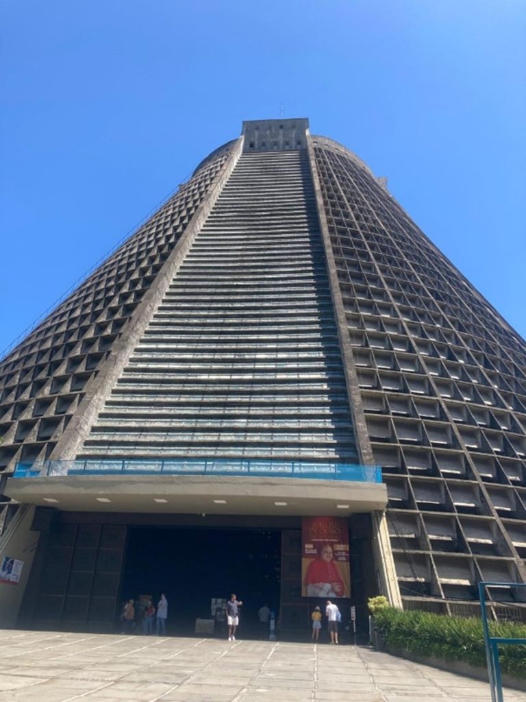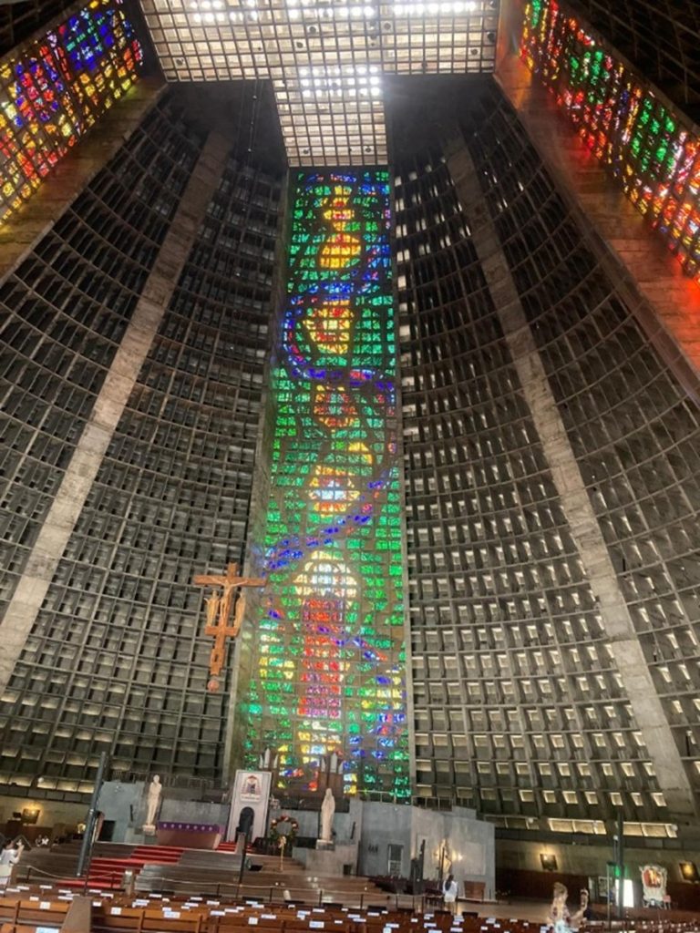 Seguimos a la Catedral Metropolitana, dedicada a San Sebastián, patrono de Río de Janeiro, que fue construida en 1964. Es un edificio modernista diseñado sobre la avenida República de Chile. Está inspirada en las pirámides de Centroamérica y combina en su diseño una planta circular con un techo en el que destaca una cruz griega, la que es proyectada por 4 vitrales. En el exterior, la cruz y campanario están separados.