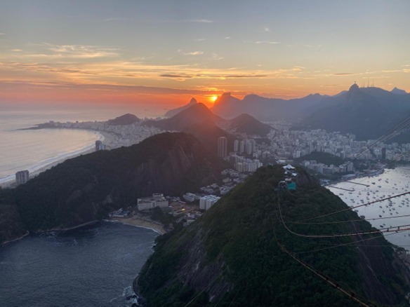 Llegamos al Pan de Azúcar. Igual que hace 44 años, con más gente diría yo, porque la media cola que hicimos antes de subir fue de al menos 2 horas. Tengo fotos de hace 44 años con pájaros del lugar. Ahora no vi ninguno, no sé si por el cansancio o porque simplemente veo menos. Arriba, una cafetería que no recordaba, y un atardecer maravilloso que coronó un día mágico, para ver finalmente Río de noche. Toda espera valió la pena.