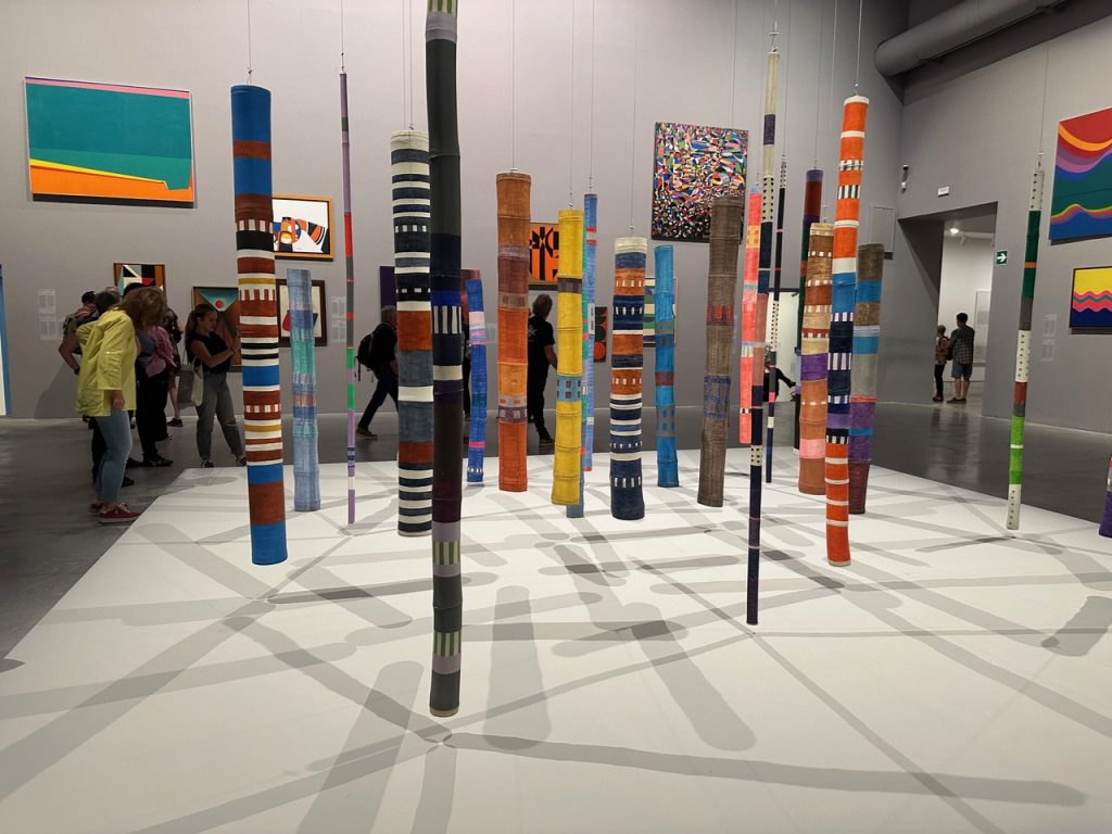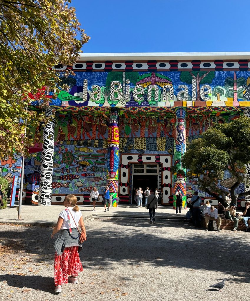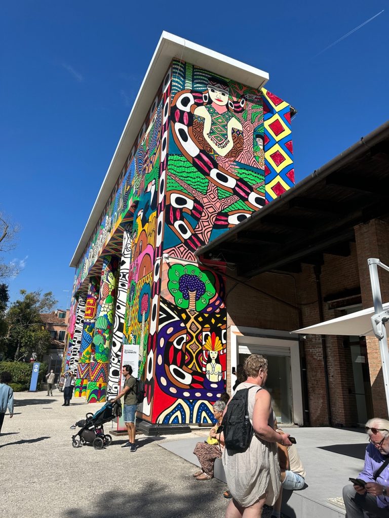 Nos costó. Pero, contra viento y marea nos hicimos el tiempo disponible. Mapa en mano, con las instrucciones que nos dio la conserje de “Casa Nova” (el hotel donde nos hospedamos a 3 cuadras de la Plaza San Marcos) intentamos aproximarnos tal como ella nos aconsejó: “Les queda a media hora caminando”. Pero, Venecia se nos complicaba fuera su circuito turístico. Así es que tomamos el Vaporetto (no la típica góndola, sino un barquito) que en minutos nos dejó en la puerta de la Bienal. Impactante… A la  entrada del Pabellón Central, ahí estaba el gigantesco mural, pintado por el grupo de artistas indígenas amazónicos: Mobvimiento dos Artistas Uni Kuin.