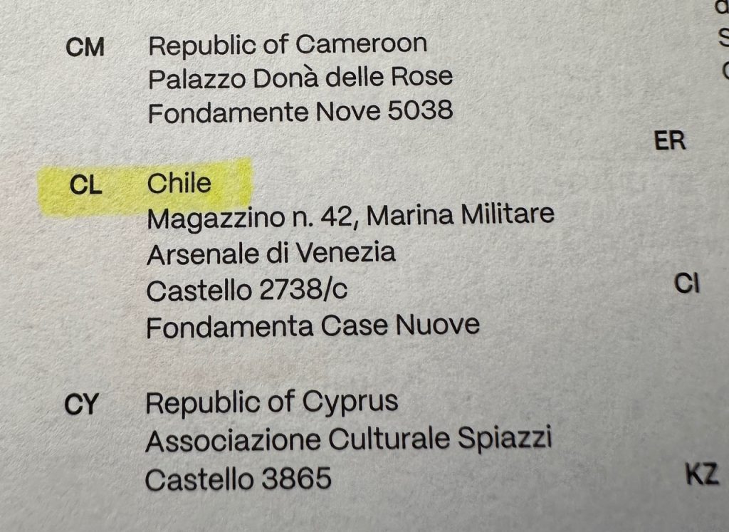 Sin embargo, la Bienal esperaba a Chile. Se lee impreso en el mismo Short Guide que adquirí en su Librería, al abandonar el recinto: prueba que al país se le había asignado pabellón nacional en el Artiglieri dell’Arsenale, inclyendo el background personal de cada artista chileno participante.